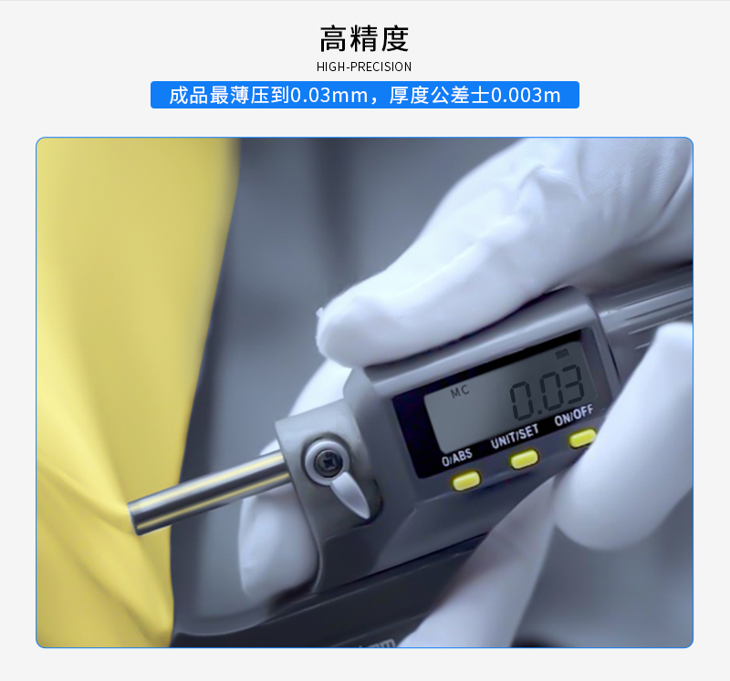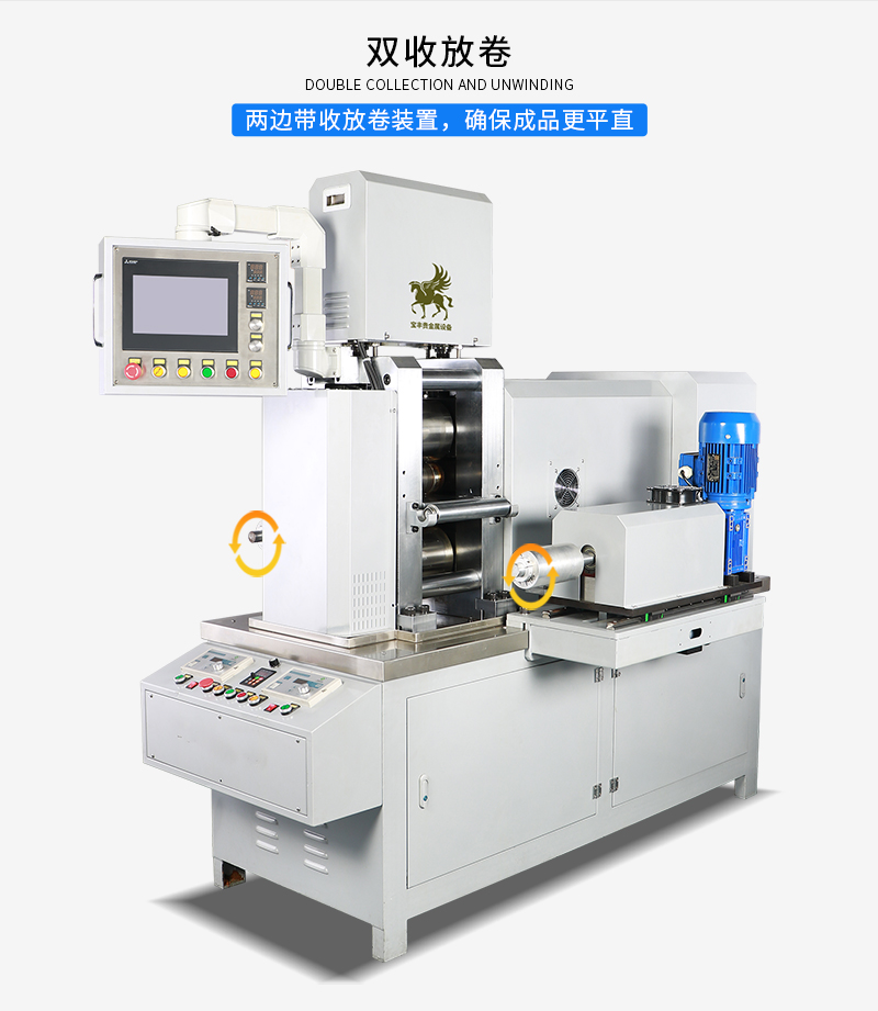 1.軋輥加熱,軋輥5分鐘升溫到250度,滿足特定材料加熱壓延工藝; 2.PLC系統,采用PLC控制系統,設備調節更精細; 3.高精度,軋輥調節精度誤差可控制在±0.001mm; 4.高硬度軋輥,軋輥硬度達到HRC58-60度; 5.收收放卷,兩邊帶收放卷裝置,確保成品更平直; 6.操作簡單,簡潔的面板設計,操作一目了然; 7.適用于鋁合金、金錫合金、鎂合金、鎳合金等脆硬材料;